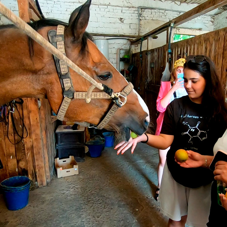Кінний клуб «Клондайк» знайомить дітей з розумними, гарними та спокійними конями, з радістю приймаючих з рук цукор та яблука.